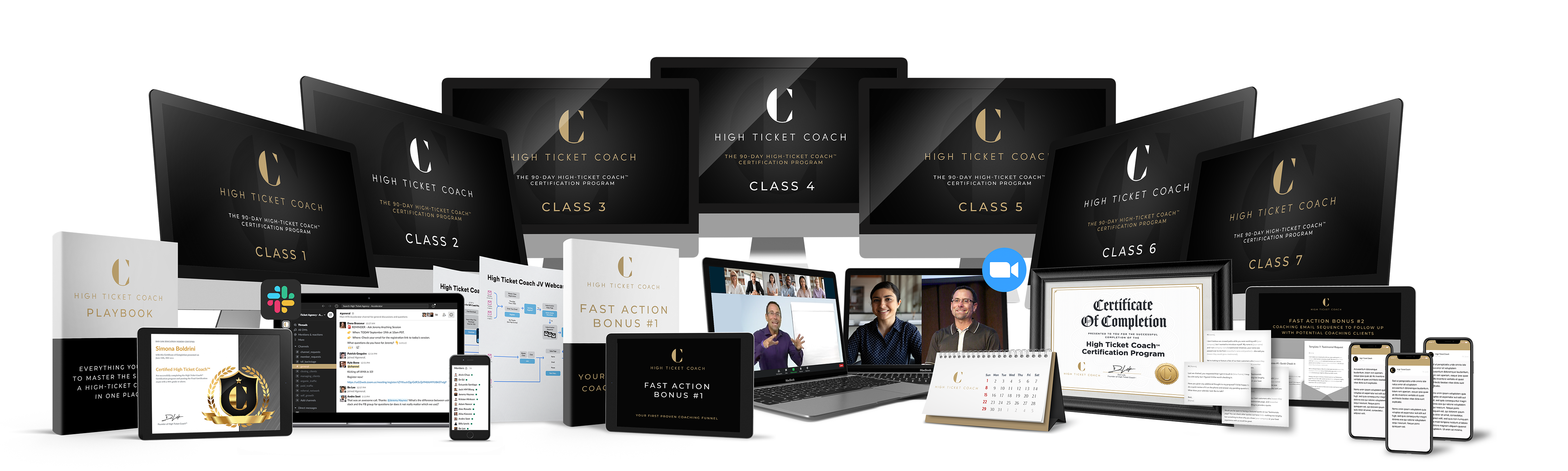 • ​The 90-Day High Ticket Coach™ Certification Program -  You will get an on-demand curriculum of classes from Alex Mandossian in your Members Area walking you through the complete High Ticket Coach™ curriculum, step by step. This master trainer and coach has generated Coach Alex nearly $417 million in sales for his students, clients and joint venture partners. (Value - $10,000)